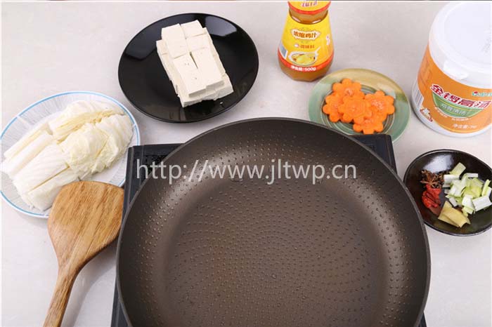 1.白菜洗凈后切長片,豆腐切塊,胡蘿卜切片備用;