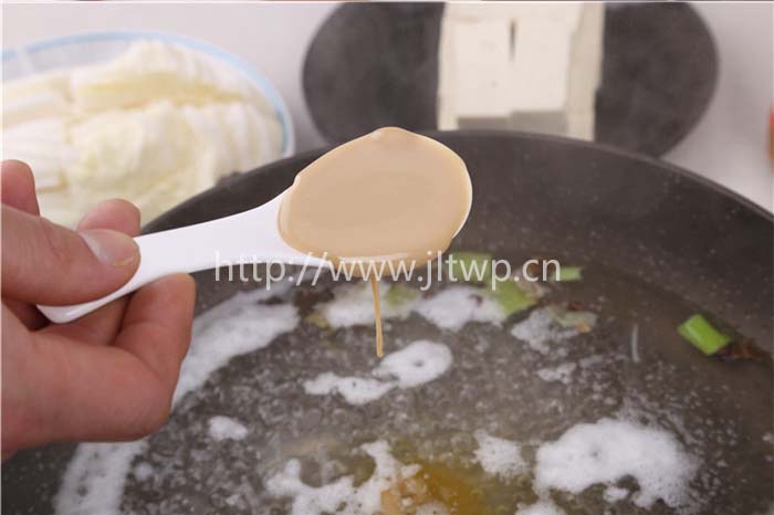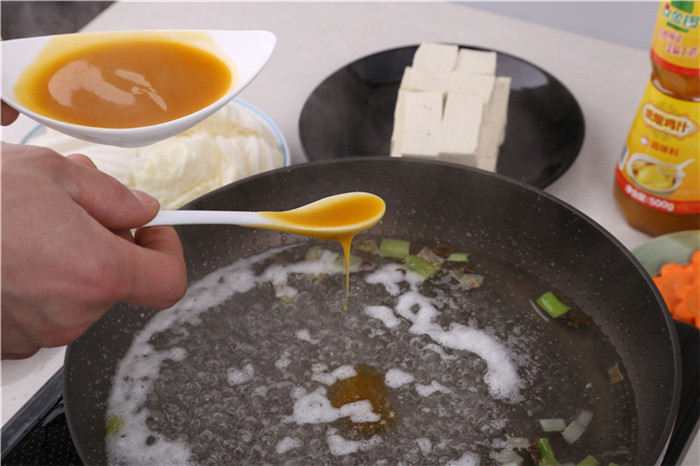 2.鍋內(nèi)加水,煮沸后加入金鑼濃香雞骨高湯、金鑼雞汁;