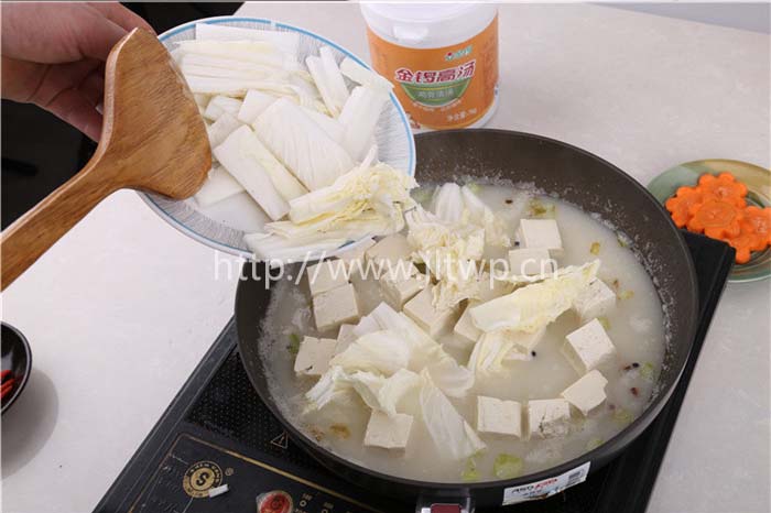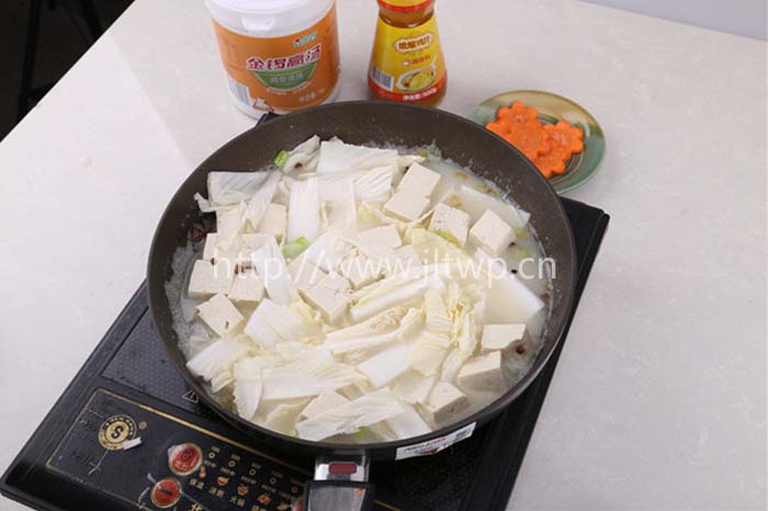 3.略煮沸后加入白菜片、老豆腐塊,再次煮沸后改小火燜煮5分鐘后加入胡蘿卜即可。