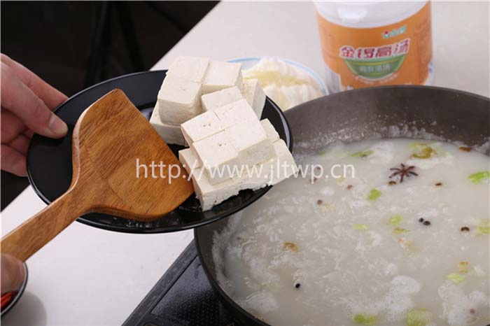 2.鍋內(nèi)加水,煮沸后加入金鑼原汁雞骨高湯、金鑼雞汁等主料;